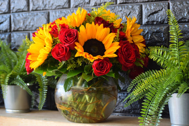 Brighten any day with SFV, a cheerful bouquet blending sunny sunflowers and romantic roses. This playful mix brings warmth and charm, perfect for spreading smiles and good vibes wherever it goes.