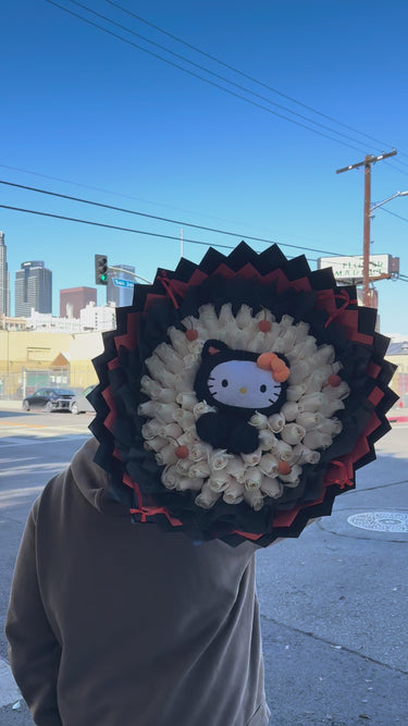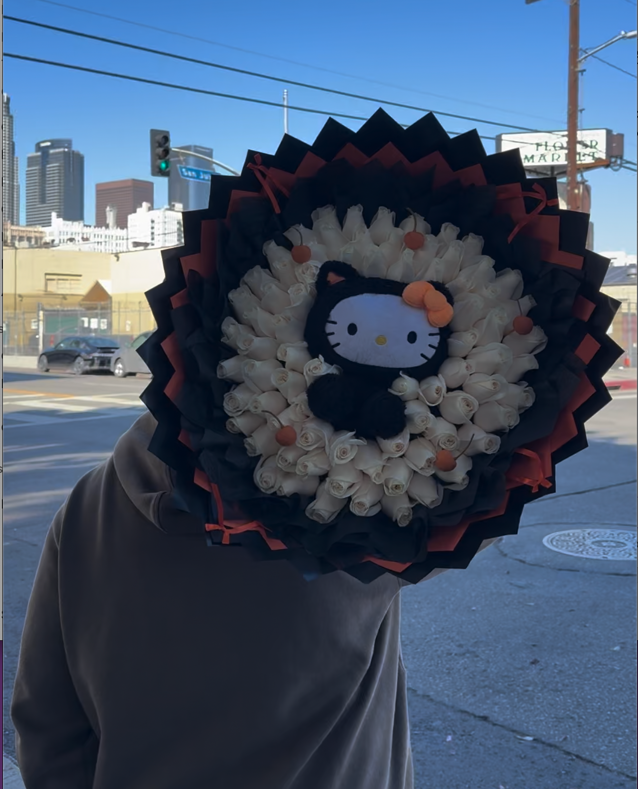 A purr-fect mix of spooky and sweet 🐾🎃 Featuring soft white roses wrapped in layers of black and orange, with a plush black Hello Kitty centerpiece. Elegant, playful, and ideal for Halloween season or any Hello Kitty lover who likes a little edge with their flowers.