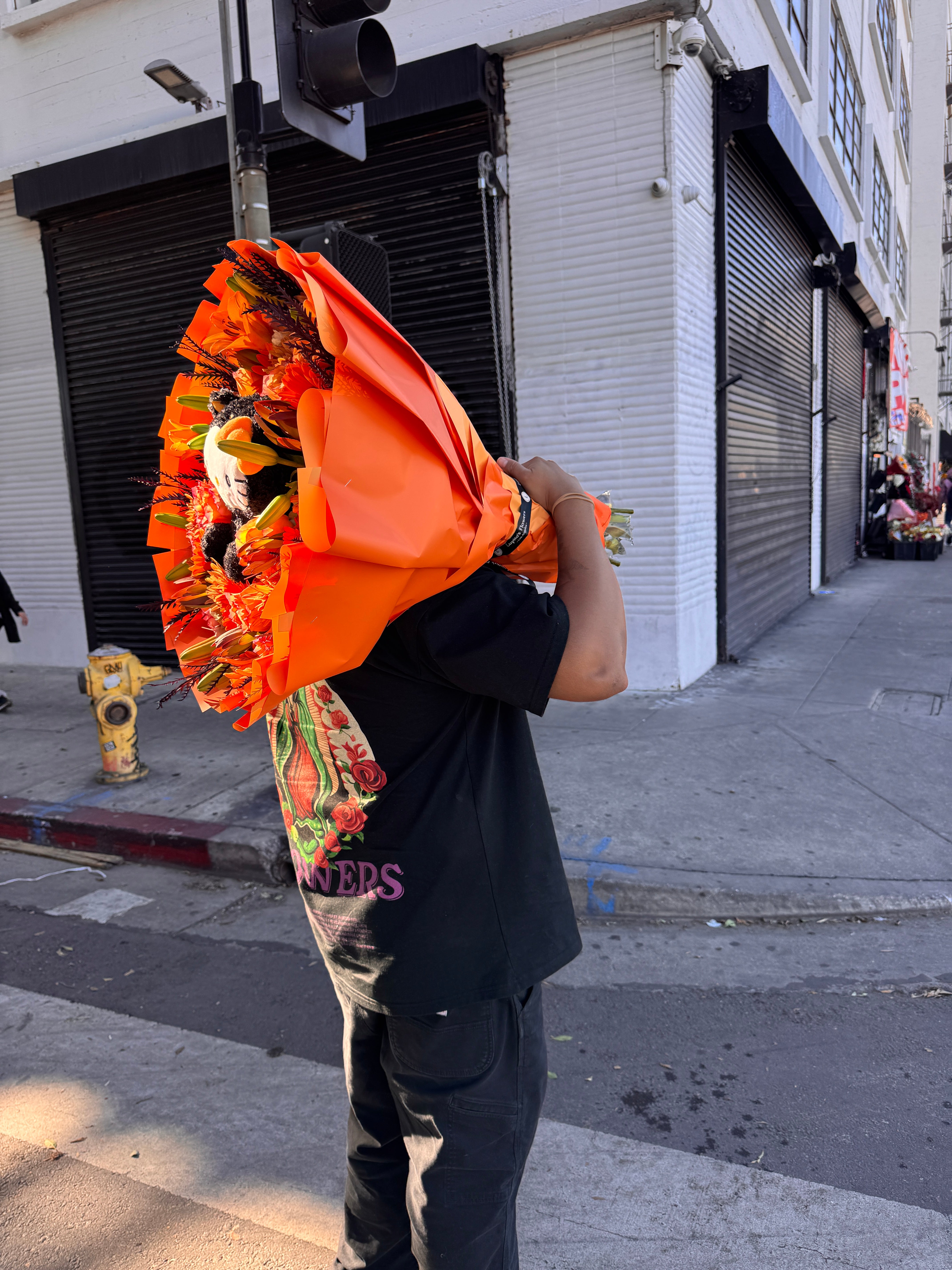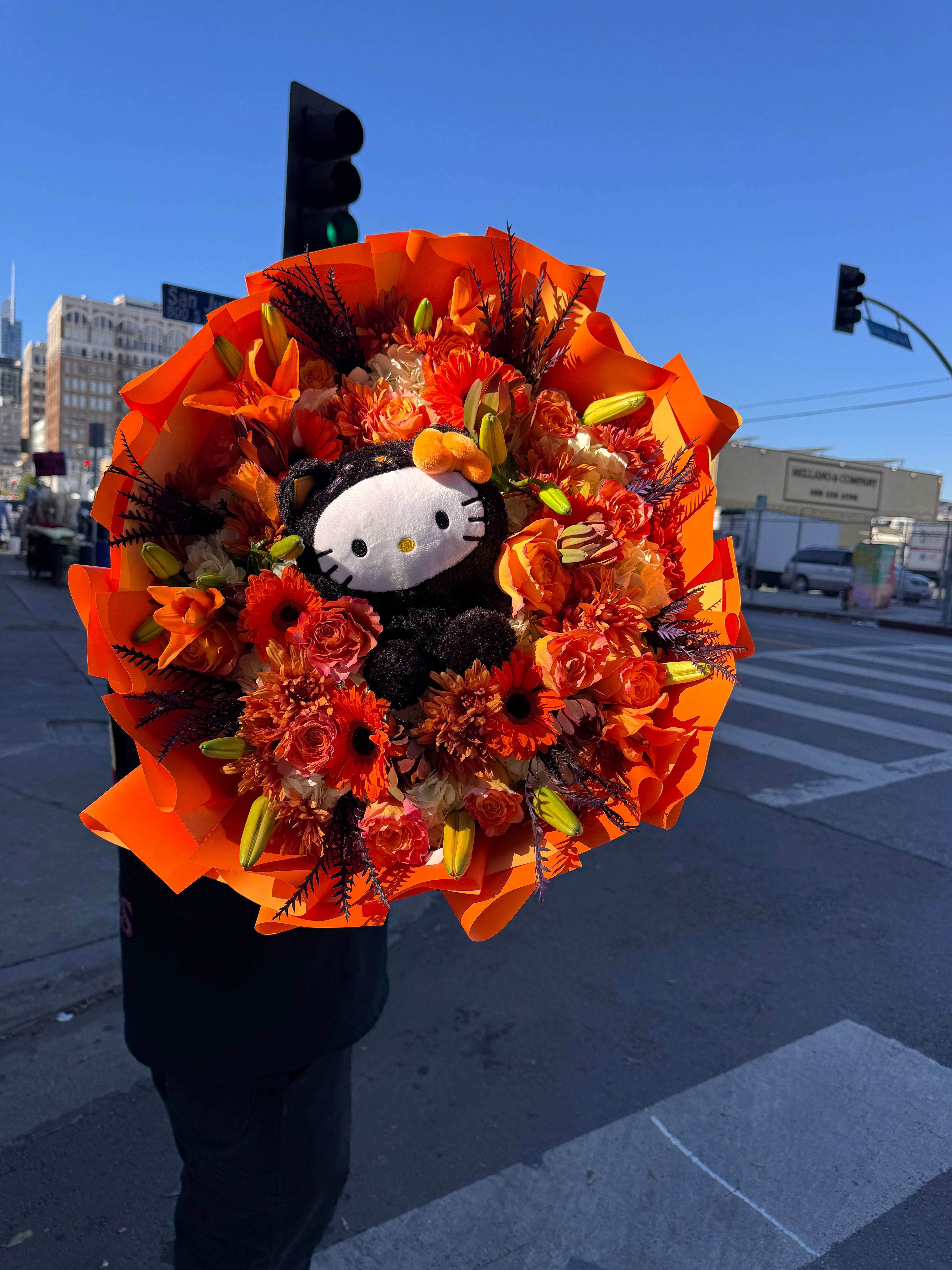 A bold mix of orange blooms and lilies wrapped in fiery orange paper, featuring a cute plush kitty centerpiece. Perfect for Halloween, fall birthdays, or anyone who loves a playful twist on elegant florals.