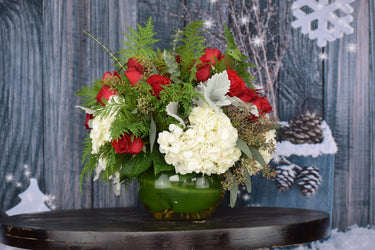 Traditional holiday tones come together with fresh greenery, lush hydrangeas, and timeless red roses—beautiful for gifting, celebrating, or elevating seasonal décor.
