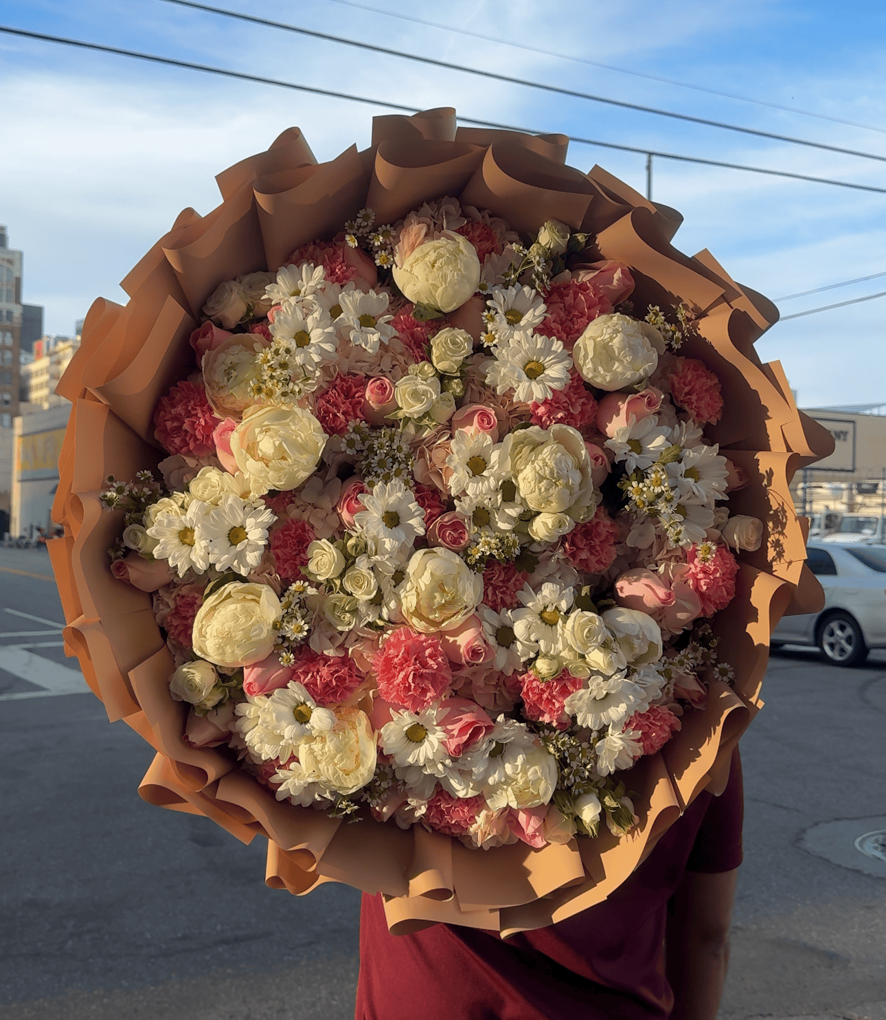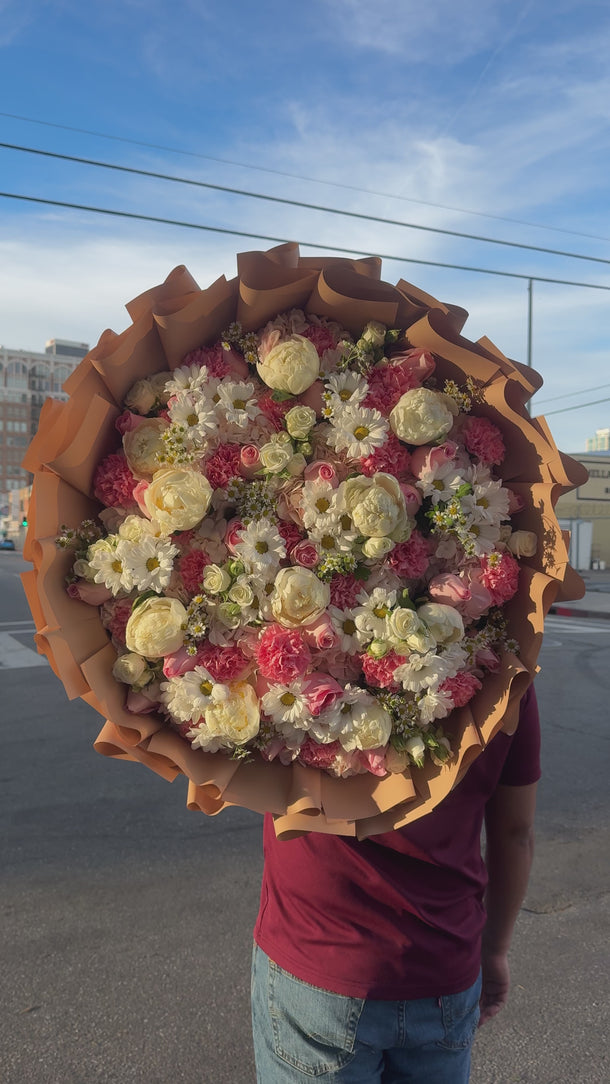 A sweet and dreamy mix of garden blooms designed in a grand, round style. Featuring premium peonies, roses, daisies, and carnations with a soft, romantic color palette. A show-stopping gift that speaks love without saying a word.