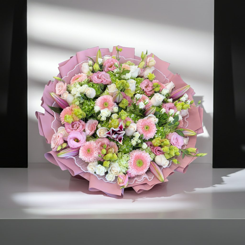 A dreamy mix of blush-toned gerberas, creamy roses, lisianthus, and lilies — this bouquet is all about elegance with a soft, romantic flair. Wrapped in rose-pink paper and layered with love, it’s perfect for birthdays, baby showers, or just because. Sweet, delicate, and effortlessly beautiful.