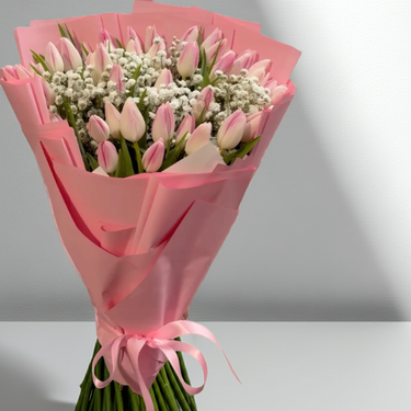 A flirty and feminine bouquet featuring elegant pink-tipped tulips paired with fluffy white baby’s breath, all wrapped in glossy pink paper and tied with satin ribbon. Simple, sweet, and straight from the heart — perfect for your soft girl era or anyone who deserves a gentle touch of beauty.