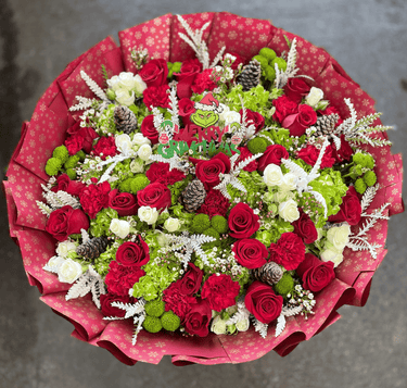 A festive Grinch-themed holiday bouquet filled with lush red roses, white blooms, green accents, and winter pinecones. Extra full and wrapped in holiday paper for the perfect Christmas surprise.