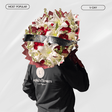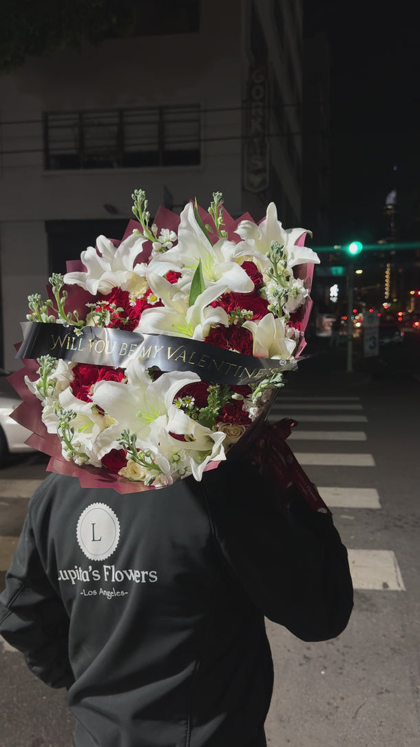 A bold and romantic arrangement featuring lush red roses and elegant white lilies, accented with soft seasonal florals and wrapped for a dramatic finish. Designed to make a statement without saying too much — timeless, confident, and unforgettable.